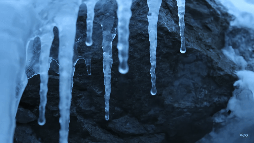 Промт: Крупный план (композиция) тающих сосулек (объект) на замерзшей каменной стене (контекст) в холодных синих тонах (атмосфера), увеличенный (движение камеры) с сохранением деталей крупным планом капель воды (действие).