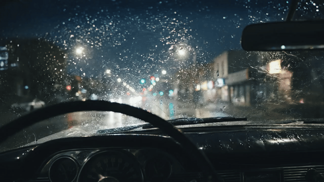 Промт: Кадр от первого лица из старинной машины, едущей под дождем, Канада ночью, кинематографично.