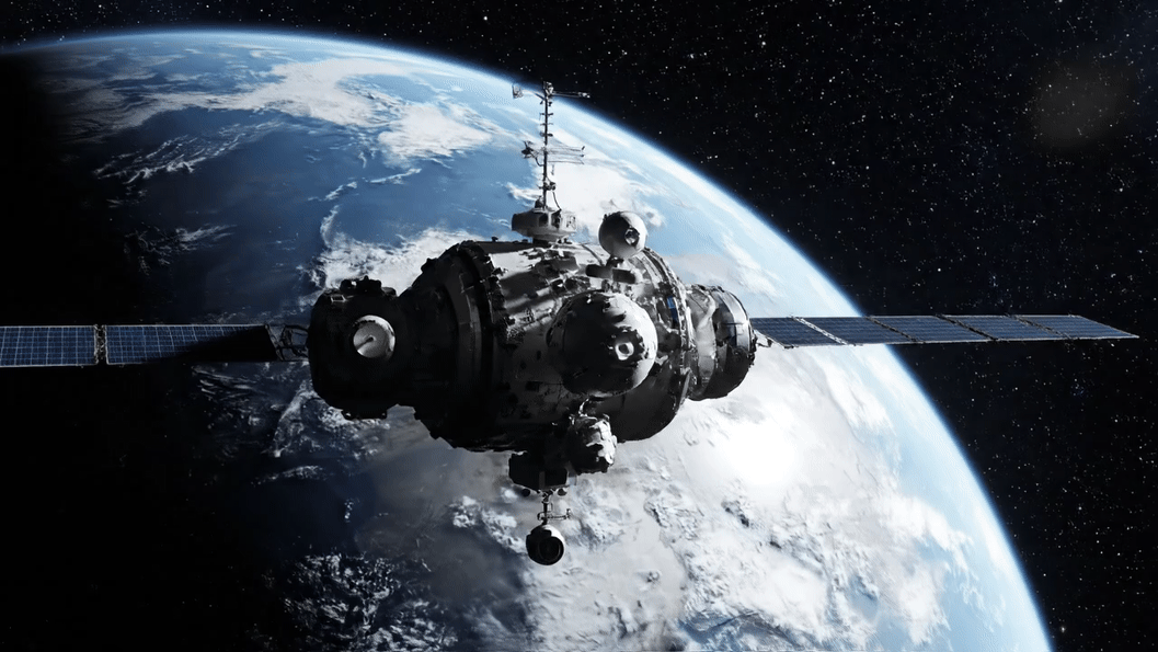 Спутник, плывущий в космическом пространстве, на заднем плане — луна и несколько звезд.
